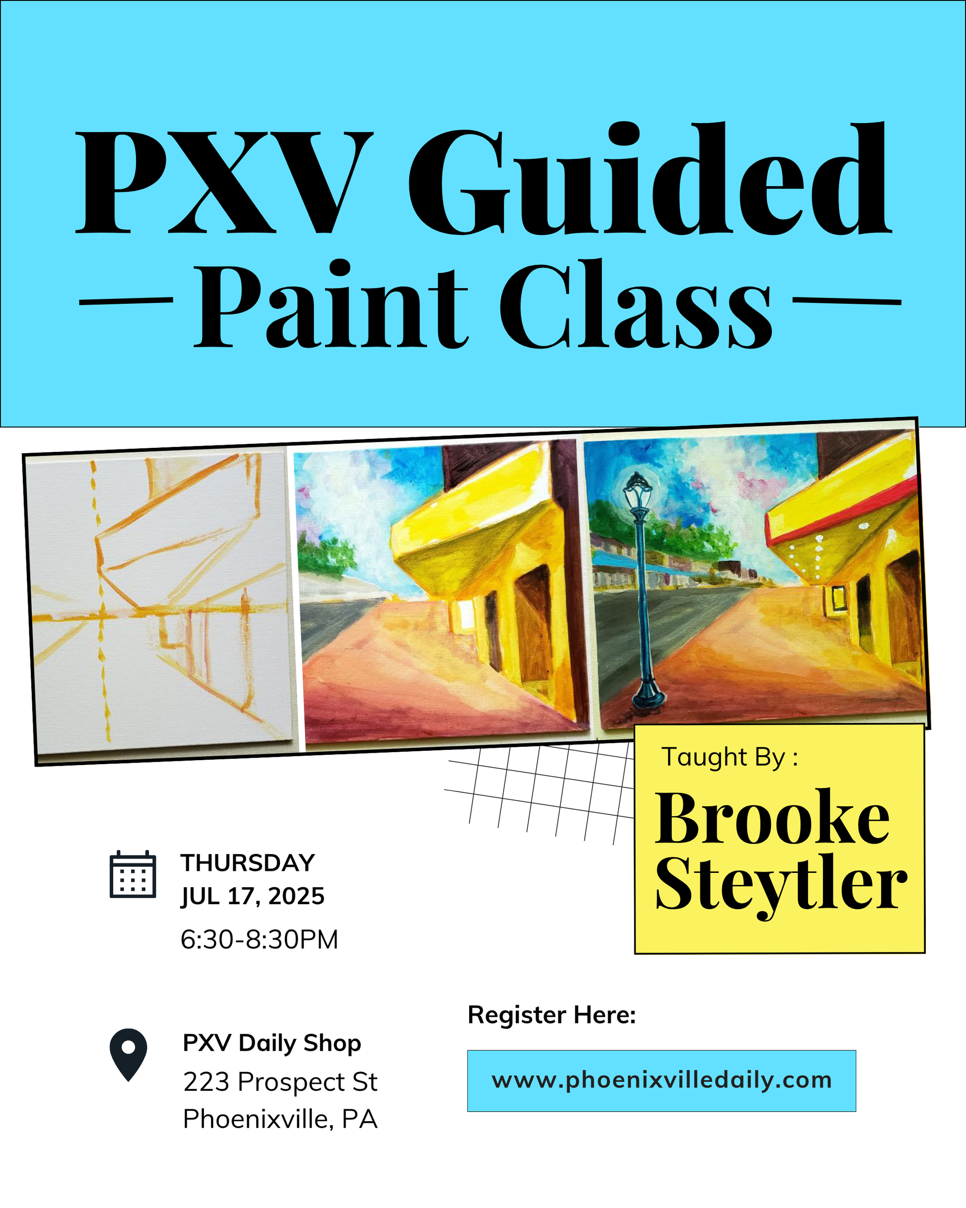 - Venue: Phoenixville Daily’s shop, gallery, and studio, based at 223 Prospect St, Phoenixville, PA 19460