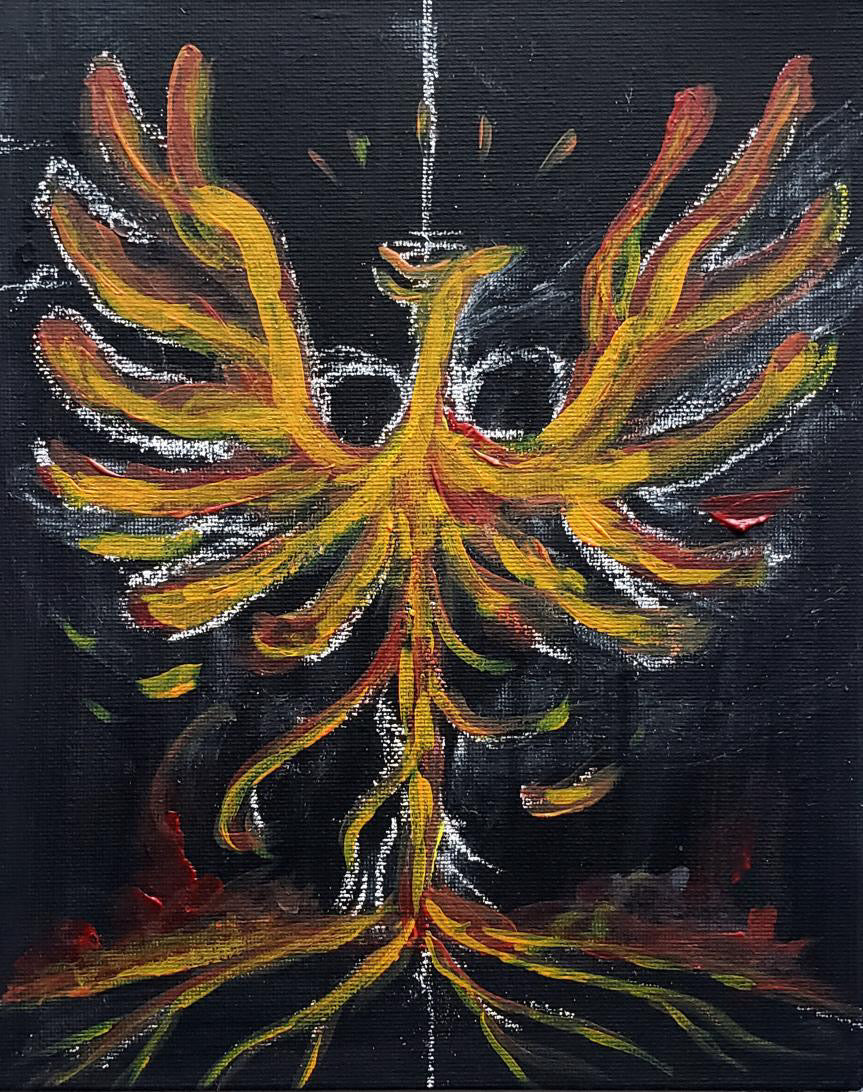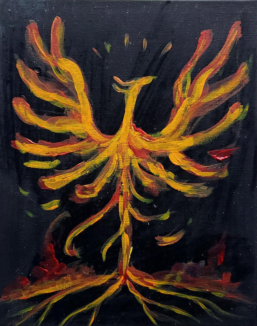 In this guided painting class led by local artist and educator Brooke Steytler, participants will create a fiery phoenix on an artist's canvas, following a structured three-step process. Each step builds upon the last, transitioning from a chalk sketch to an energetic, glowing final painting.