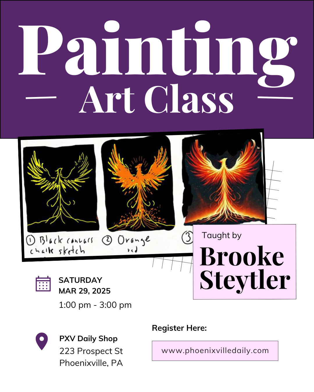 Phoenixville Daily proudly presents its first art class with local artist and educator Brooke Steytler. The class runs for two hours and includes group and individual instruction as needed. All materials and instruction are included in the class cost.